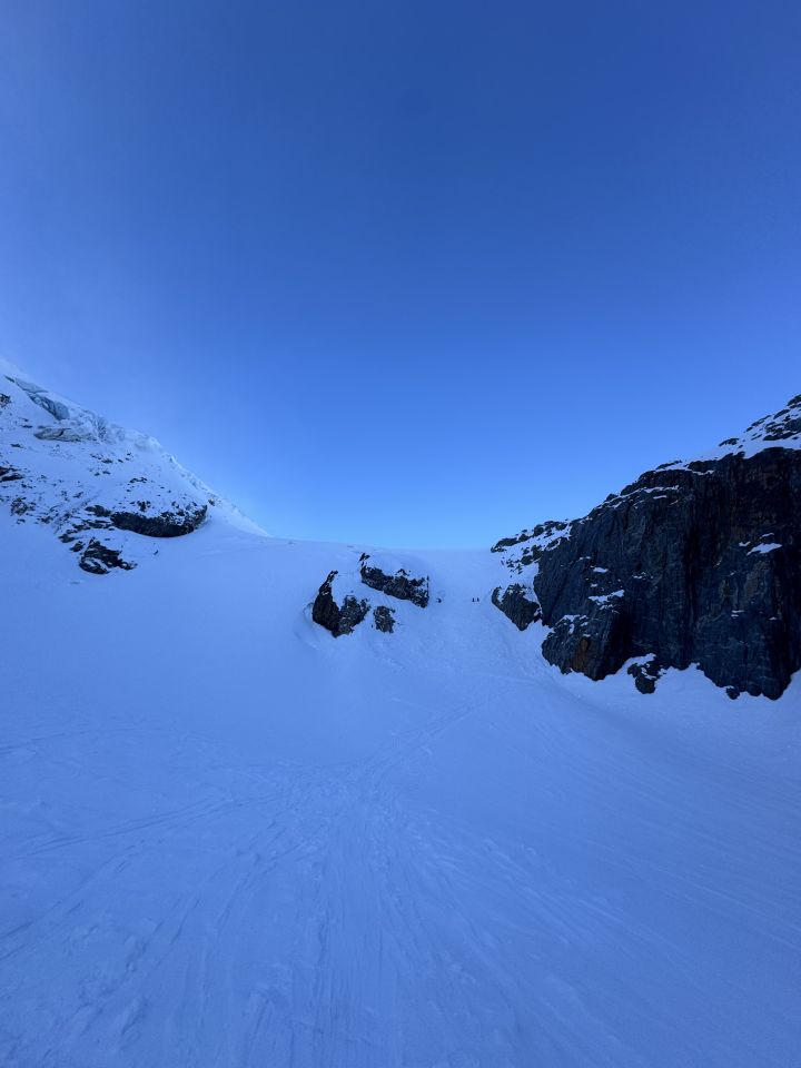 Fast durchgehende schneedecke ab steingletscher, im anfang 1 mal kurz tragen. Steilstufe war machbar mit ski, nach 2/3 gutem spur zum hochlaufen. Jetzt ist steilstufe verfahren