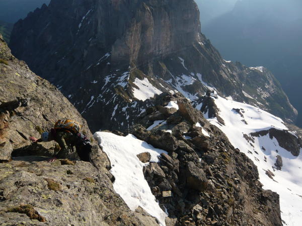 Es hat ab ca 2000m teilweise Schnee auf der Route, zum Teil sehr mühsam und auch heikel, wegen warmen Temperaturen nicht tragend. Um 5 Uhr vom Biwak gestartet and auch da schon teilweise Oberschenkeltief eingebrochen, an anderen Stellen wiederum tragende Schneedecke. Ab Hütte immer wieder Schnee auf dem Grat, aber es war trotzdem gut möglich (mit Pickel). Abstieg um ca 9 Uhr über den Grat, 3-4 mal abseilend. Schnee-Abschnitte dann sehr müsham, da durchnässt. Unterhalb vom Biwak kann man ca 100-200hm auf dem Füdli abrutschen