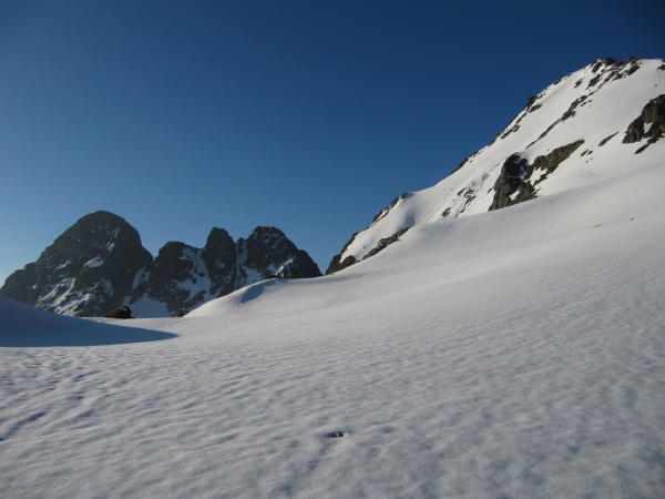 Auf dem Flüela Schwarzhorn sind die Tragstellen oberhalb der Schwarzhornfurgga bereits grösser. Das kleine Schwarzhorn schaut von unten her noch recht gut aus.