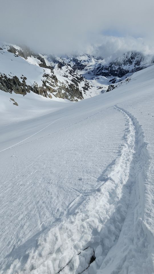 unten sulz, mitte schwerer schnee, oben 30cm powder. der oberste nordost hang bietet heute 20 bis 30cm top powder bis mitte steilimigletscher. dann wirds schwer. also gleich nochmal hoch und dopelt geniessen.