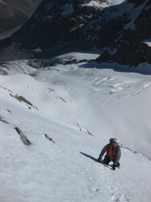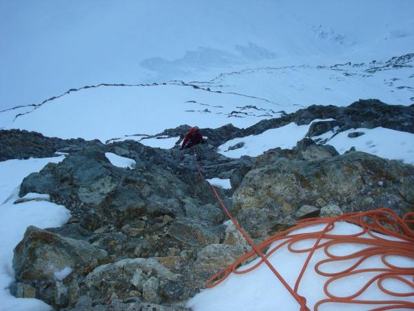 Den Felsriegel haben wir ziemlich links in zwei Seillängen durchstiegen. Fels trocken und mit einigen Firnpassagen nicht schwierig, Absicherung ist aber recht problematisch. Unterhalb und im Riegel liessen sich mit Friends aber zwei akzeptable Stände einrichten, zuoberst im Firn musste dann der T-Anker hinhalten.