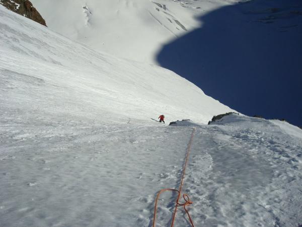 Der Bergschrund am Wandfuss konnte problemlos passiert werden, danach links über ein kleines Firnband hinauf unter den Felsriegel. Alles in gutem Trittschnee.