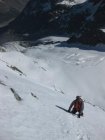Danach wieder nach links aufsteigend in unangenehm lockerem Pulver auf Blankeis. Hier nochmals eine Seillänge gesichert. Zum Schrauben-setzen mussten hier z.T. mühsam Löcher gebuddelt werden.
