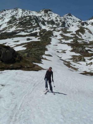 Start 5:30 Uhr. Vom Pass weg eine durchgehende und durchgefrorene Schneedecke. Abfahrt ca. 10:00 durch die Südost-Flanke bei idealem Sulz. Über den Grat zur Fibbia Ski 30 min tragen. Auch von der Fibbia noch schöne Sulzschwünge. Gegen Mittag zum Pass hin der Schnee dann klebrig.