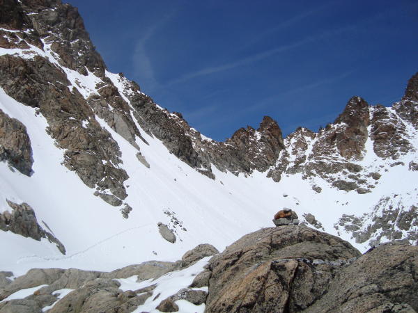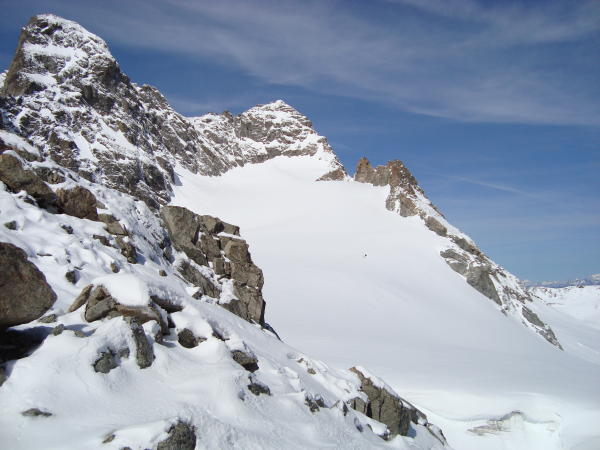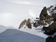 Vom Albulapass bis d'Es-cha Hütte lockeres wandern,nur die 3 Schneefelder sind weich und man bricht teilweise ein. Von der Hütte bis auf 2800m guter, harter Trittschnee(im Aufstieg),ab p.2808 bis Porta d'Es-cha teilweise Knietief abgesoffen. Vadret Porchabella um 9.30Uhr auch schon Plutsch. Die erste Spalte mitten im Gletscher ist offen und man sieht, das nur noch 50-70cm Knochenbrecherschnee daraufliegt. Der hält heute nix. man bricht zeitweise bis unter die Hüfte durch.