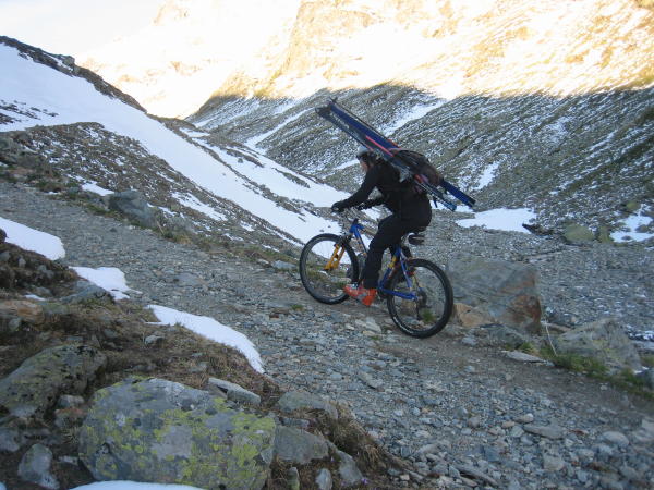 Hart gefrorener Schnee mit hauchdünner Neuschneeauflage. Unsere Abfahrt erfolgte um 10:45. Gute Schneeverhältnisse (dort wo es noch Schnee gibt). Mit dem Mountainbike bis fast zur Klostertaler Hütte. Von dort beinahe durchgehend Schnee.