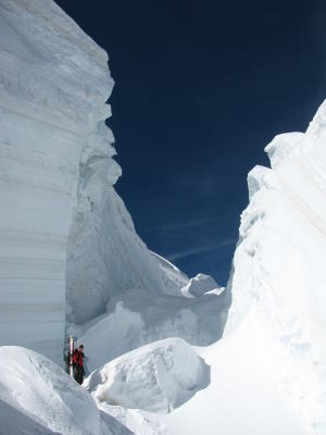 Tacul-Rimaye-Pasage mit Steigeisen spektakulär durch Sérac-Zone. Maudit-Mauer hart und griffi. Mit Steigeisen bis oberhalb Mur de la cote (fiese Spaten zum springen im ABstieg vom Maudit...). Mit Harsteisen bis Gipfel. Pulver am N-Hang des Gipfels bis GRand PLateau, dann immer wie frühlingshafter bis runter zur Jonction - wenig Spuren, daher traumhafte Abfahrt! Jonction z.T. zu Fuss / angeseilt, da schon sehr offene Spalten... Lästiger Moränenmarsch kurz nach Jonction zurück zum PLan de l'Aiguille - vive l'été!