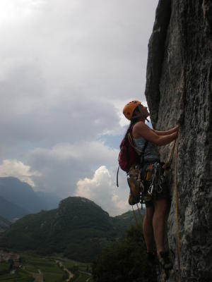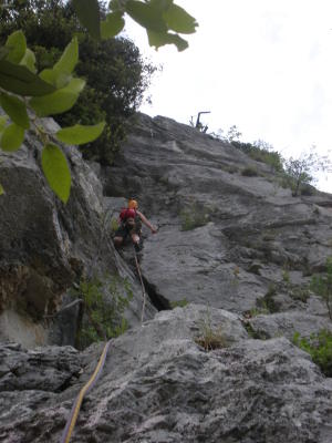 Zustieg: Von der Brücke in Dro folgt man der Straße nach Maso Lizzone für etwa 300m. Nach Kurve rechts und links um ein Grundstück herum, gehts rechts weg. Man geht auf Steigspuren über das Geröll und taversiert den Wald in Richtung Süden bis zum Einstieg. Oder man parkt in Ceniga, geht über die Ponte Romano nach Maso Lizzone und weiter bis etwa auf die Höhe der Wand. Bei der Aufschrift "arrampicata" zweigt man nach links und folgt einem Weg durch das Feld für ca. 150m bis zu einem Steinmann. Man folgt dem Steig mit Steinmännern durch den Wald bis zum Einstieg. Routenname ist angeschrieben. Ca. 30 Min.