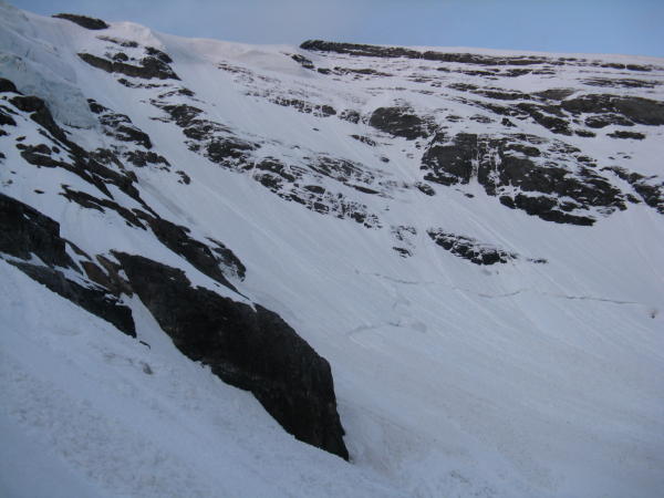 Zahlreiche Nassschneerutsche bereits am Vortag vom Nordsporn aus beobachtet.