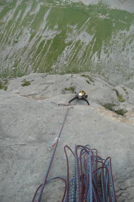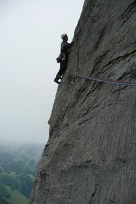 Am morgen Wand noch ziemlich nass. Hat dann aber relativ schnell etwas abgetrocknet und Chrüzspinne war eine der trockensten Routen. Sehr schöne Linie durch die steile Wand.