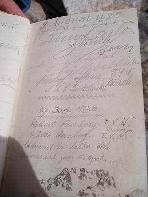Genial alpine Kletterei im soliden Fels. Kaum begangen. Das zeigt auch das Gipfelbuch mit Einträgen von den 30er Jahren.