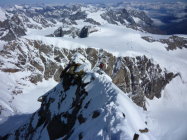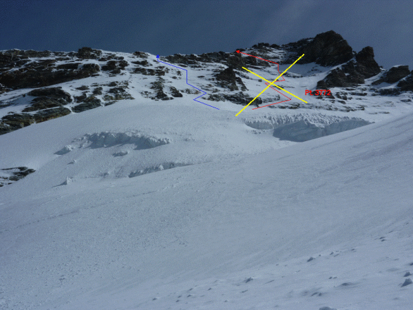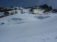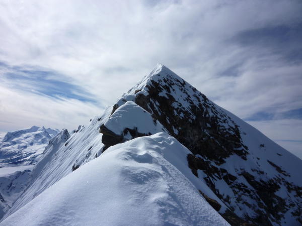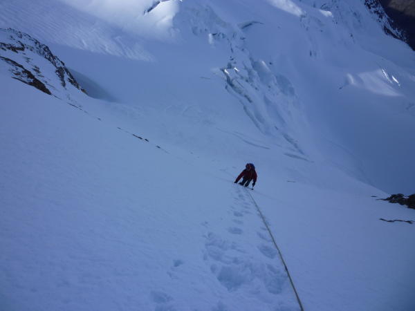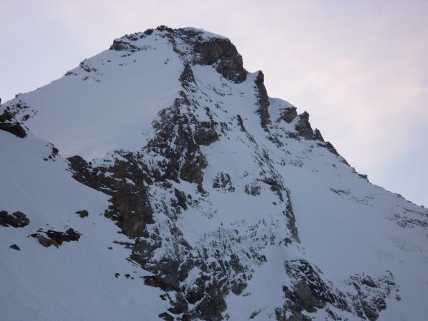 Gletscher wider Erwarten tragend gefroren, die Schneeschuhe hätte man nicht unbedingt mit hochschleppen müssen. Die SW Flanke wies dünne Eisauflage mit wenig Firn auf, teilweise war der Aufstieg sehr heikel, da kaum Sicherungsmöglichkeiten. Der Aufstieg weiter links (siehe Bild) ist wesentlich unkomplizierter, wir begingen diese Route im Abstieg. Bei Ausaperung ist aber eher der Weg übers Tiefmattenjoch zu empfehlen (nicht im SAC Führer beschrieben). Hierzu gibt es einen recht detaillierten Gipfelbucheintrag an anderer Stelle. Vom Genussfels des Westgrats war aufgrund der pulvrigen Schneeauflage (ca. 30 cm) wenig zu spüren, insgesamt war alles teilweise heikel. Dafür war das Wetter top, man kann ja nicht alles haben!