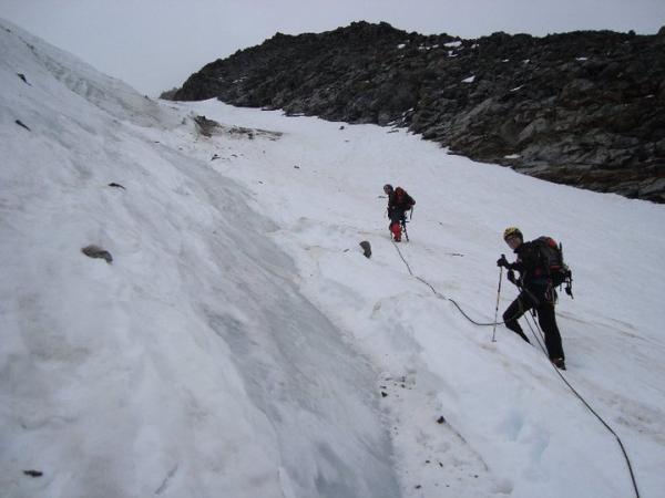 bis zum Gletscher problemlose Wanderung; auf dem Gletscher tiefer, weicher Schnee (anstrengendes Spuren); an der steilsten Stelle befand sich direkt unter dem Schnee Blankeis, so dass wir dort mit Steigeisen drüber sind; Spaltengefahr bestand insofern nicht, da alle noch ziemlich voll mit Schnee waren (kann aber aufgrund des weichen Schnees trügerisch sein, bei uns passierte jedenfalls nichts); Abstieg zur Innsbrucker Hütte schneefrei bis auf einige problemlose Schneefelder;