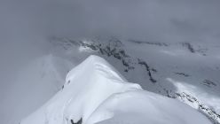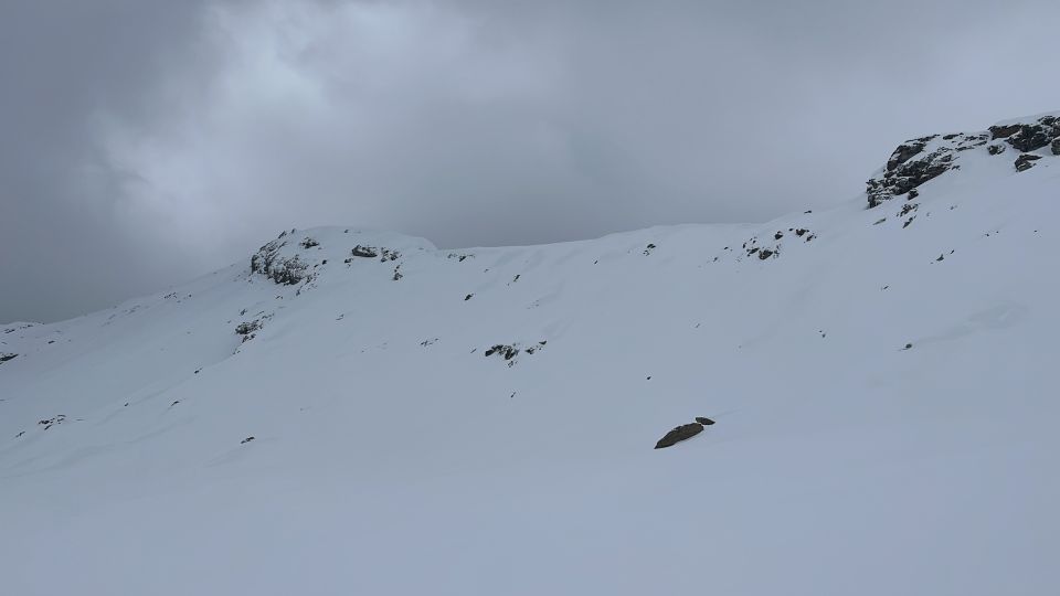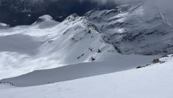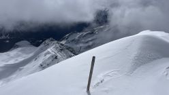 Nach dem Lifthäuschen stach ich mit zwei kurzen Kehren direkt auf den Grat zu P. 2631 hoch. Dieser steile Osthang schien mir zwar noch nicht ganz verfestigt aber ohne Spannung zu sein.