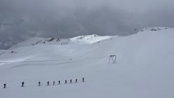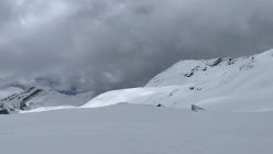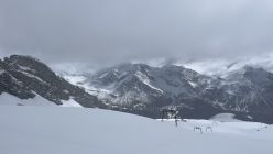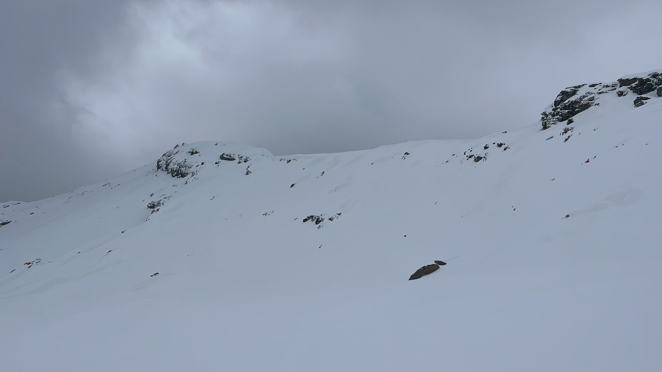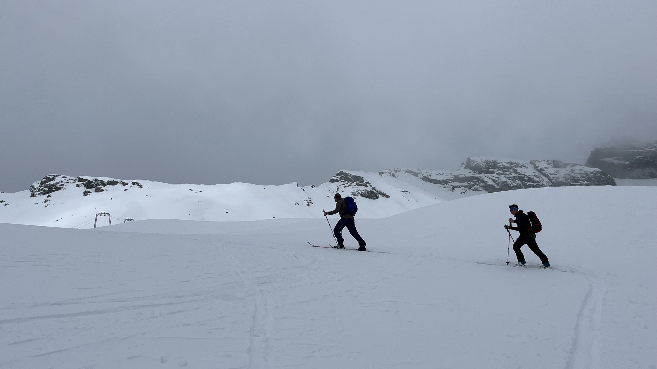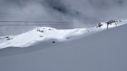 Nachdem sich die Sonne nun nur noch homöopathisch blicken liess, versuchte ich im Blindflug eine einigermassen gute Linie zum Lifthäuschen des obersten Liftes zu finden (Höhe 2500), wobei nun der noch nicht verfestigte Neuschnee von vorgestern etwas Spurarbeit erforderte.