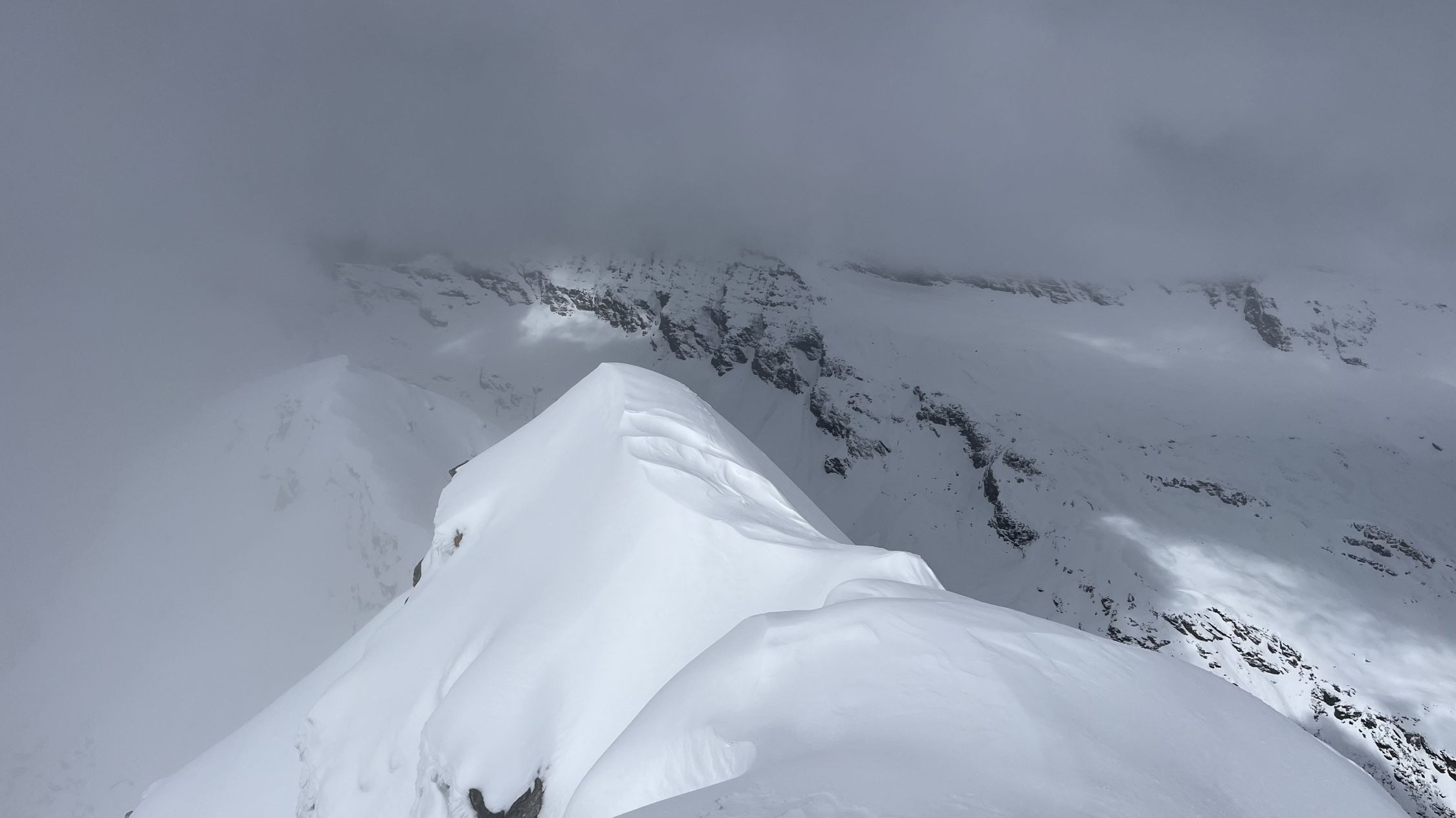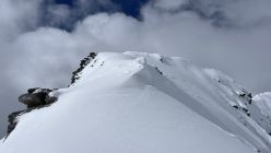 Über den flachen aber schmalen und exponierten Grat ging‘s zunächst zum „Point of no return“ (P. 2681), der sich unmittelbar vor einem steilen und recht ausgesetzten Hangteilstück befand.