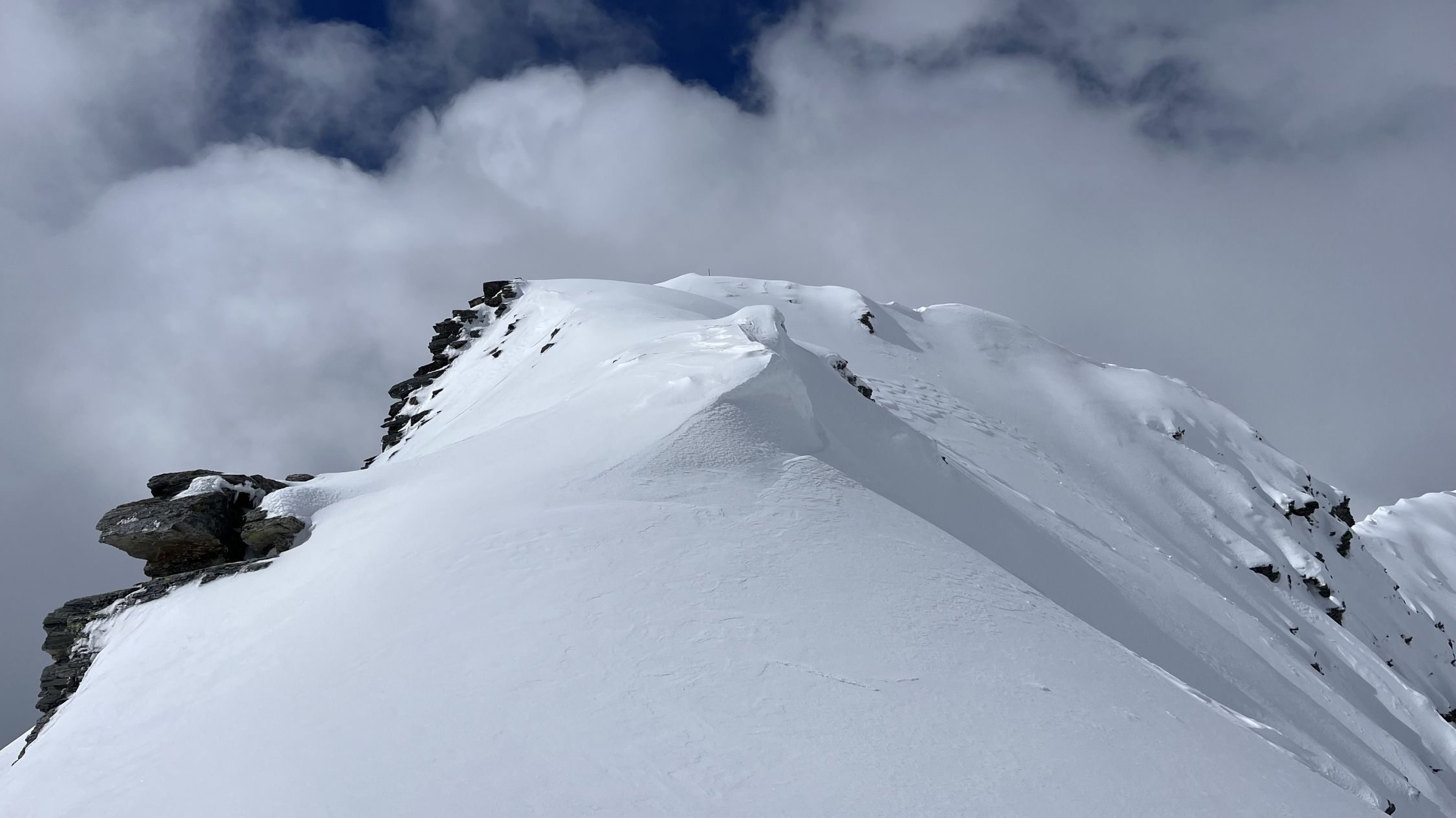 Zum Glück guckte kurz vor der Entscheidung für eine Viertelstunde die Sonne durch den Nebel, so dass ich das Gelände gut einschätzen konnte und - alles hart an der linken Gratkante folgend - zum absolut windstillen (!) - Gipfel gelangen konnte.