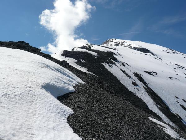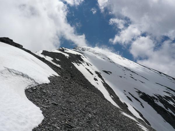 Bis in den Rindersattel ohne Probleme. Auf dem Grat liegt noch etwas Schnee, sonst auf Pfadspuren zum Pkt.3197 hoch. Danach mit Steigeisen über die Flanke hoch. Der Schnee war heute nicht gut gefroren, was ein Knietiefes, zum Teil Hüfttiefes Einsinken zur folge hatte! Sonst sehr gut zu machen. Ab und zu trug es auch, und da waren Steigeisen pflicht. Flanke wird sicher noch eine Weile gut zu begehen sein ohne Eis. Vorsicht am Gipfelgrat, noch relativ grosse Wächten auf Leukerbadnerseite.