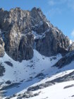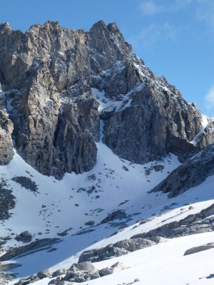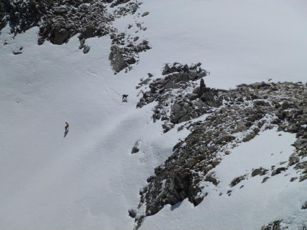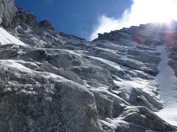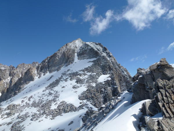 Nach einer kalten Nacht war der Schnee(ab ca.2600m)durchgefrohren.Steigeisen ein muss,oder man erklettert den Grat zwischen den Casnilpässen, ist griffig und trocken.Ab Casnilpass Nord versuchte ich das Couloir durch die Südwestwand (heute nur mit Steigeisen und Pickel möglich, hart und griffig).Ende Couloir zwei Varianten:nach rechts auf den Südgrat,Fels mit Millimeter dicken Eisschicht überzogen oder 10m vor dem Ende des Couloirs links in die Westseite steigen und den(+/-)Steinmännchen folgen, was heute bei diesen Verhältnissen auch nicht überzeugte.
