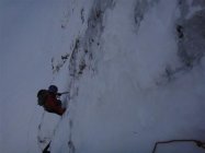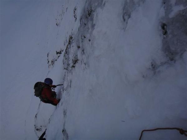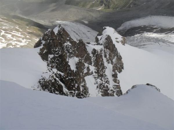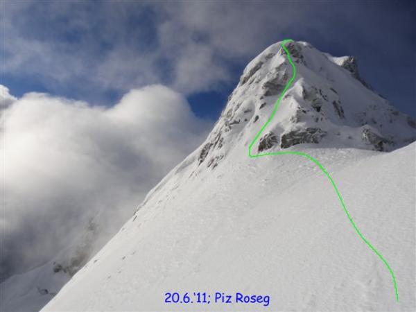 Wir stiegen etwa in der Mitte des unteren Felsriegels ein, querten zuerst nach rechts und gingen dann über die Schneerampe links queren. Gerade hoch und über den zweiten Felsriegel in zwei Eisrinnen (tolles Eis) über den Felsriegel. Danach gerade hoch über das Schneefeld. Die Felsen dann rechts umgehend und nach links hoch. Wir sind dann nicht auf die Schneekuppe, sondern direkt zum Sattel zwischen Schneekupppe und Piz Roseg. Wir hatten teils Trittschnee, teils hart geforenen Schnee und im obersten Teil war der Schnee pulverig, zugedeckt mit einer Eisplatte. Das Seil hatten wir aufgrund der guten Verhältnisse bis zum Sattel im Rucksack gelassen.