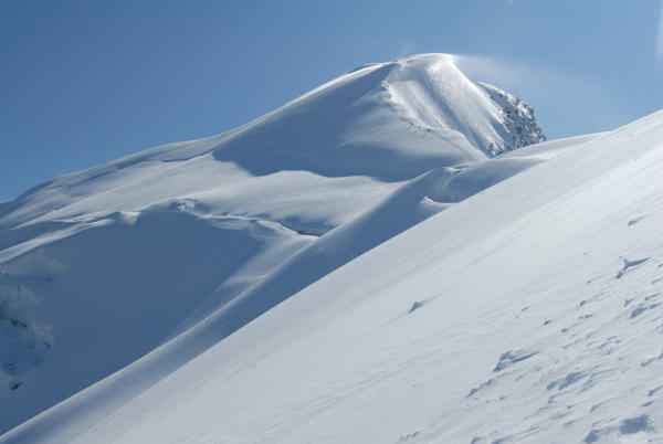 Sehr gute Verhältnisse. Durchgehend schneebedeckt bis Gipfel. Gegen später ggf. Probleme mit weichem Schnee und einsinken. Bestes Wetter, aber ab Grat sehr stürmisch.