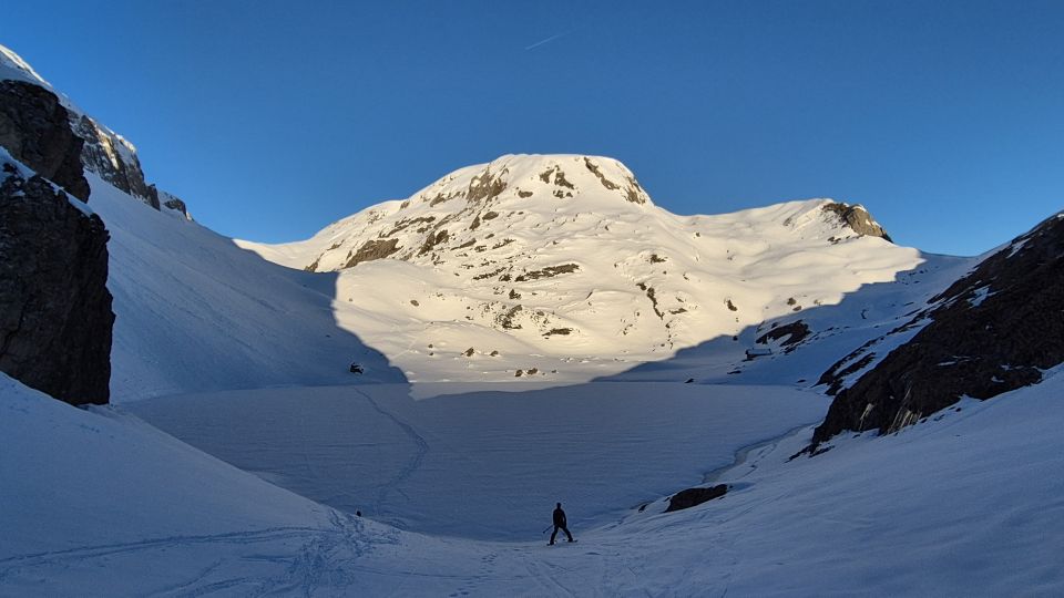 Iffigenalp ist schneefrei, nach der Bachquerung 1646m müssen die Ski getragen werden. Durchgehende Schneedecke schattseitig ab ca. 1700m. Gefrorene, tragende Schneedecke. Mit der Höhe zunehmende Neuschneeauflage, sehr angenehm zu gehen und wo nötig zu spuren.