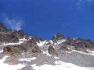 Gipfelanstieg vom Sattel im Fels brüchig, aber noch weitestgehend in einer guten, aber steilen Firnrinne gangbar.