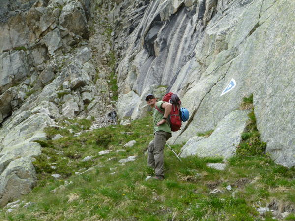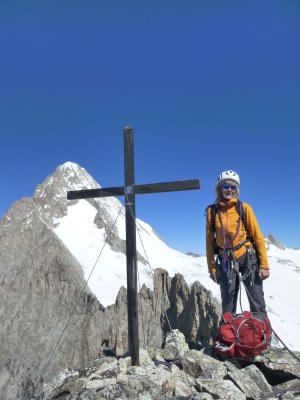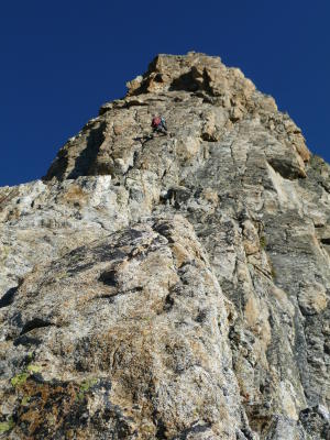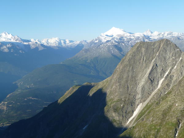 Für die Tour sind ab Turm 2 Kletterfinken angenehm, ab Turm 5 wird's ohne schwierig, bei einer Schlüsselstelle von ca. 6-. Es handelt sich hier zwar nicht um eine schwierige, aber eine sehr lange Tour, bei der die sichere Wegfindung sehr entscheidend ist. Auch der Abstieg über den langen Ostgrat darf nicht unterschätzt werden. Die Abseilstelle bei der Rinne neben der Roten Wand ist problemlos zu erreichen. 1 x abseilen und über Geröllhalden zurück zum Biwak. Normalerweise sei um diese Jahreszeit hier Schnee zum Runterrutschen, jetzt ist aber alles schon staubtrocken. Vom Gipfel bis Ausserberg sind es halt doch noch 2000 Hm runter. Statt den Suonen entlang, gingen wir durch den Tunnel. Dort wars angenehm kühl nach so einem heissen Tag (Taschenlampe nötig!). Wir waren die Einzigen auf dieser Tour :-) Es war ein genialer Tag auf einer super schönen Tour mit Rinaldo Borra!! Herzlichen Dank...