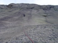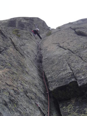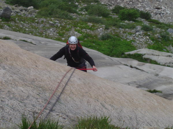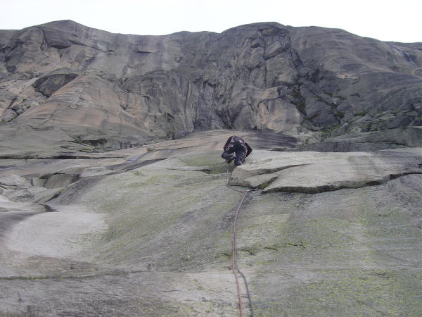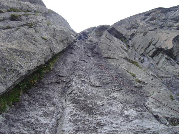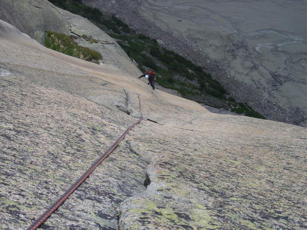Die Route ist homogen in der Schwierigkeit; als Crux empfanden wir die Reibungsplatte der 2.SL.