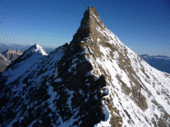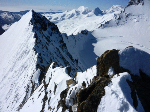 Beim Start um 3:00 auf der Mischabelhütte zeigte das Thermometer an der Hütte leichte Plusgrade, dennoch war die Schneedecke tragend gefroren. Wir überquerten den Bergschrund im rechten Wanddrittel (siehe Bild), mit Eisgeräten momentan noch eher unschwierig (der gegenüberliegende Rand liegt halt etwas höher…). Die Felsen im unteren Wandteil waren teilweise eisüberzogen, die richtigen Linien ergeben sich aber bei der Betrachtung des weiteren Routenverlaufs. Nach den Felsen querten wir rasch in Richtung Gipfelfalllinie, mittlerer Wandteil war eher hart, oberes Drittel wies guten Trittschnee auf, teilweise fast etwas locker. Links beginnt die Wand bereits wieder auszuapern. Ab 5:30 erreicht die Sonne den obersten Wandteil. 6:00 Lenzspitze, von dort teilweise heikler Abstieg ins Nadeljoch (50 min). Es hat noch relativ viel Schnee, der teilweise schlecht verbunden ist. Die steilen Passagen im Abstieg sind zudem kaum absicherbar. Ab dem Nadeljoch wurde es dann wesentlich besser, da die Türmchen auf der Aufstiegsseite größtenteils ausgeapert sind (Bild). Schattseitig sind alle Türmchen plattig, die Schneeauflage bot keinen Halt. Dank Abseilstangen auf allen Türmchen ist Abseilen in die jeweiligen Scharten problemlos. Insgesamt ab Nadeljoch Genusskletterei in schönem Fels, v.a., bei den warmen Temperaturen zu Wochenanfang. Zeitbedarf für den Grat ca. 3 h, wobei wir zügig, aber nicht gehetzt unterwegs waren. Abstieg vom Nadelhorn ins Windjoch weist an den Umgehungen der Gratfelsen z.T. schon wieder Eis auf, auf Hohbalmgletscher bereits um 10:00 knietiefes Einsinken.