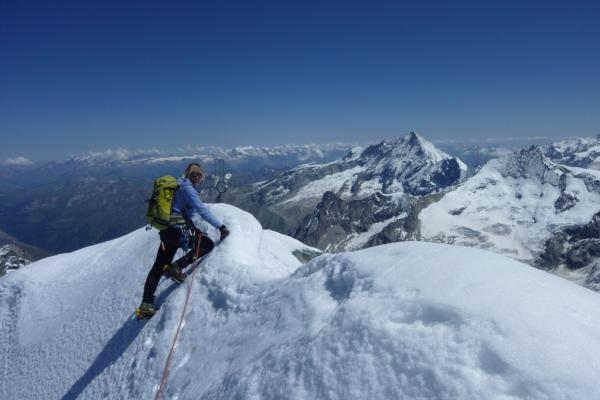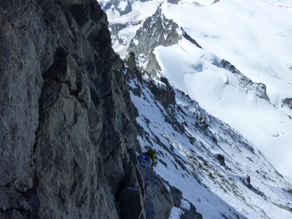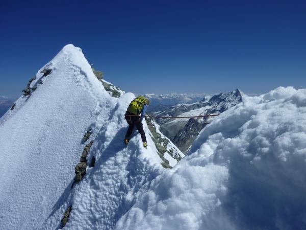 Am Grat gabs noch recht viel Schnee mit einigen grossen Wächten. Wir mussten alles mit Steigeisen gehen. Dent Blanche Hütte ist noch geschlossen. Gletscher noch gut Schnee bedeckt.