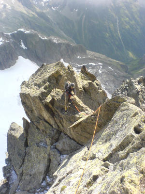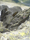 Der Fels war trocken und sehr gut kletterbar. Das Firnfeld, das man überqueren muss, um zum Einstieg zu gelangen, war am Morgen noch gefroren - Steigeisen sind hier hilfreich. Beim Abstieg am Mittag war der Schnee so weich, dass man problemlos runter laufen konnte.