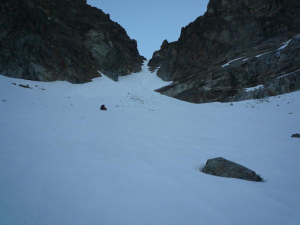 Die Rinne hat guten Trittfirn und lässt sich gut durchsteigen.