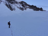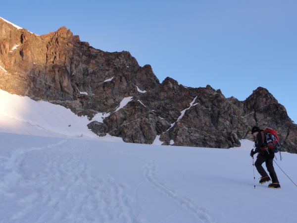 Sehr gut: harter Firn, Bergschrund unterhalb der Kletterei leicht überwindbar