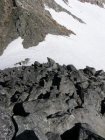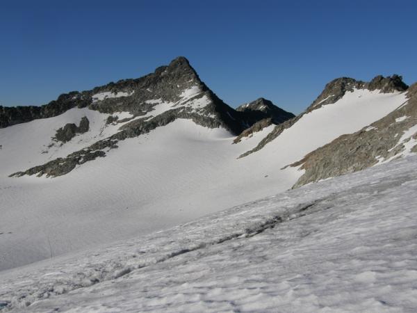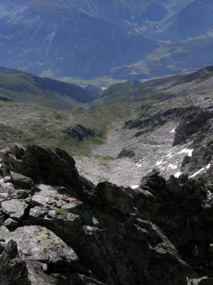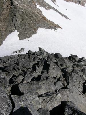 Abstieg nach S möglich, zunächst etwas exponiert (II) und dann durch ein Couloir zum flachen Teil des Skigebietes, scheint nicht attraktiv zu sein, sind über Brunnigrat zurück nach Caischavedra.