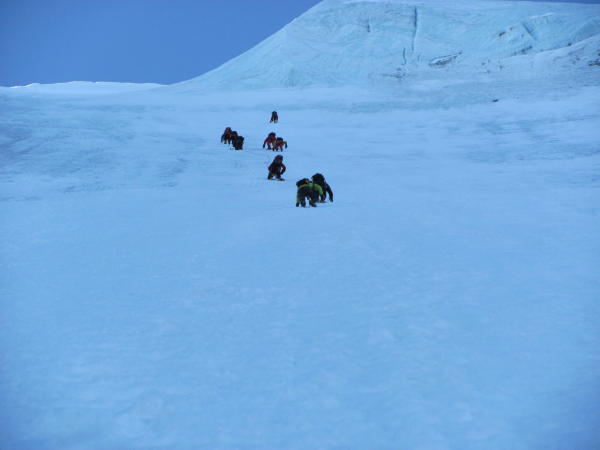 Noch ausgezeichnete Verhältnisse in der Wand. Bergschrund ist problemlos passierbar. Richtung Ausstieg auf den Grat kommt nun etwas Eis hervor, sodass die meisten Seilschaften die letzten 2,5 Seillängen sichern. Heute befanden sich ca. 20 Leute in der Wand. Diese verteilten sich erstaunlich gut und somit war nur der unausweichliche Eisbeschuss von oben störend. Abstieg (über die Normalroute retour zum Rifugio Chabod) am Vormittag noch sehr gut gefroren und somit kein Einsinken.