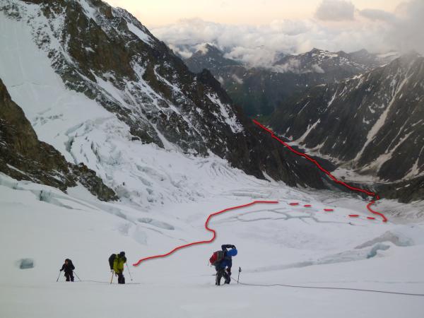 der gletscher oberhalb der hütte weist auch noch recht geschlossene spalten auf und es findet sich ein weg in's col grise.