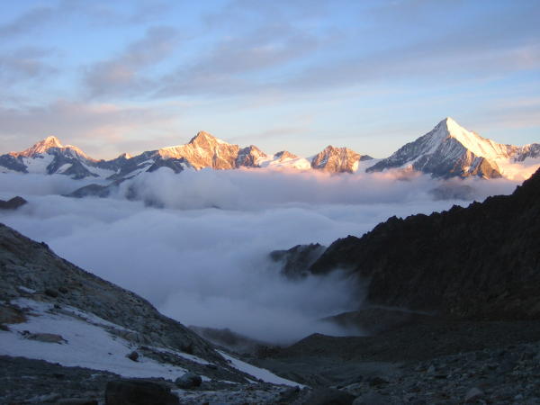 Das Rimpfischhorn bietet eine sehr schöne kombinierte Hochtour. Da aufgrund des schlechten Wetters vom Vortag insgesamt nur drei Seilschaften am Berg unterwegs gewesen sind (wir waren die einzigen von der Täschhütte) war diese Tour ein Hochgenuss für Ruhe und Einsamkeit. Bewirtung auf der Täschütte wie immer klasse!