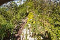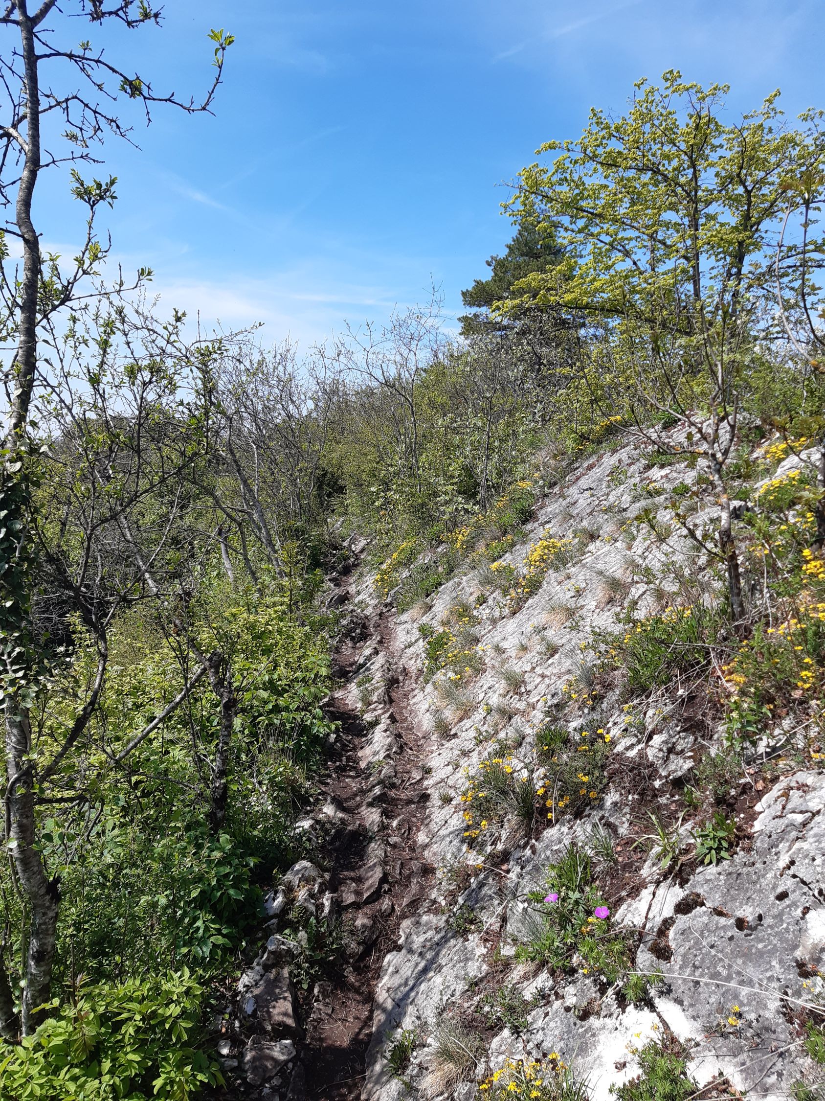 Schmaler Gratweg, phantastische Vegetation. Paradies für Vögel, Eidechsen und co. Jetzt schon sehr warm. Im Sommer wird es wohl sehr heiss. Tolle Aussicht auf verschiedene Orte.