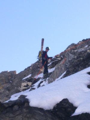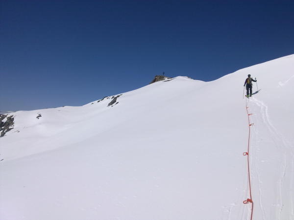 Sehr gute Verhältnisse für eine Sommer-Skitour. Wir konnten direkt ab der Bergstation abfahren. Die Steilstufe ist problemlos begehbar, auch ohne Steigeisen. Auf dem Gletscher gingen wir am langen Seil, s. Übersichtsfoto. Wir sind um 11:30 Uhr im aufkommenden Nebel vom Gipfel aufgebrochen.