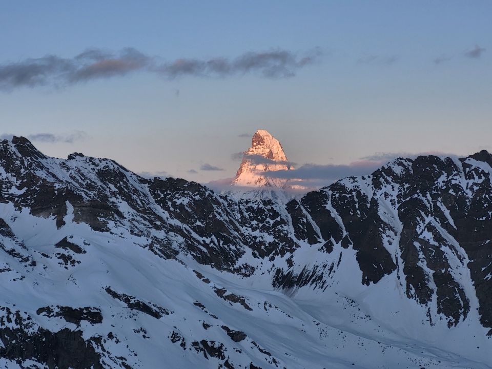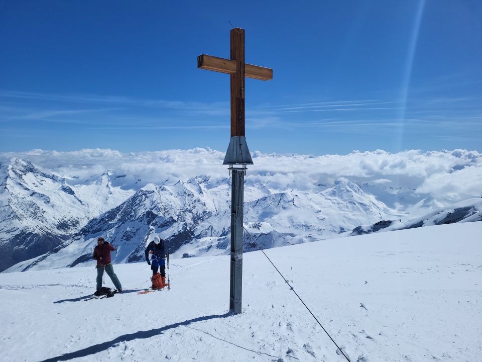 Immer noch tolle Verhältnisse für den Alphubel. Gletscher gut eingeschneit. Aufstieg zur Täschhütte ab Eggstadel auf Skis (bis dort mit Taxi). Am Sonntag Abend hat es noch wenig geschneit, aber es war dann in der Nacht klar, so dass der Schnee am Morgen gefroren war. Wir sind um 05:30 Uhr in der Täschhütte los und waren um ca. 11 Uhr auf dem Gipfel. Auf dem Gipfel war es windig und kalt. In der Abfahrt nach Saas Fee hatten wir ziemlich alle Schneearten und konnten bis zu den Fussballfeldern skifahren.