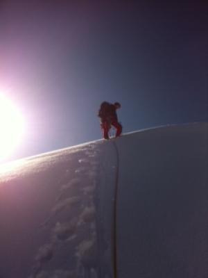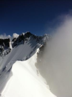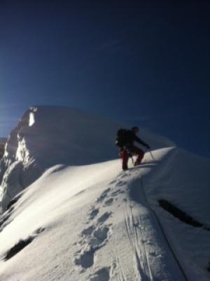 Traumverhältnisse. 5cm Schnee auf den Felsen des 2. Aufschwung, stören aber nicht. Eisnase und Gipfelwand in Top-Trittschnee (!!!), Aufstieg und Abstieg problemlos. Gipfelpleatau hat 20cm Bruchharsch, aber jetzt ist gespurt. Wir haben uns leider entschieden auf den Grat links des Gipfels zu gehen. Von dort zum Gipfel eine SL heikle Kombikletterei,abseilen aber möglich.
