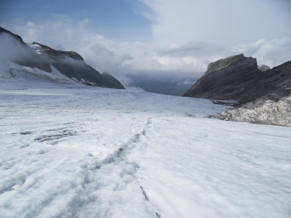Am Morgen noch schön und warm, trockene Felsen am Schwndner Grat. Gletscher bis 2600 m Schneefrei und Hart. (Steigeisen von Vorteil)