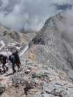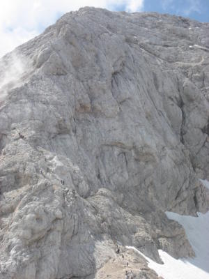 Wir haben trockene Verhältnisse vorgefunden. Die Felsen an den viel begangenen Klettersteigen am Gipfelaufbau sind stellenweise schon sehr abgescheuert und werden bei Nässe zur Gefahr.
