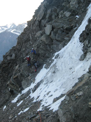 Gute Verhältnisse. Kein Blankeiskontakt dank der vielen Schneefälle, auch bei der oftmals heiklen Stelle auf 4150 müM. Am Gipfelgrat jedoch noch recht viel Schnee (Wächten, die abgeschaufelt werden mussten). Betreffend den etwas schwierig zu findenden Abstieg von der Festi-Kinlücke hinunter auf den Kingletscher erhält man auf der Domhütte hervorragende Auskunft !