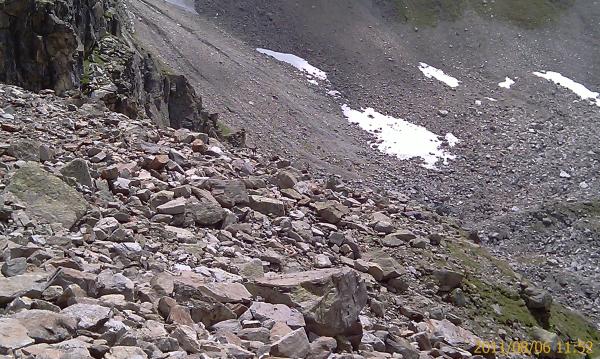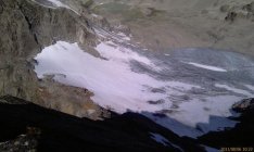 Firnfeld guter Trittschnee, Fels oben noch nass und sehr rutschig.