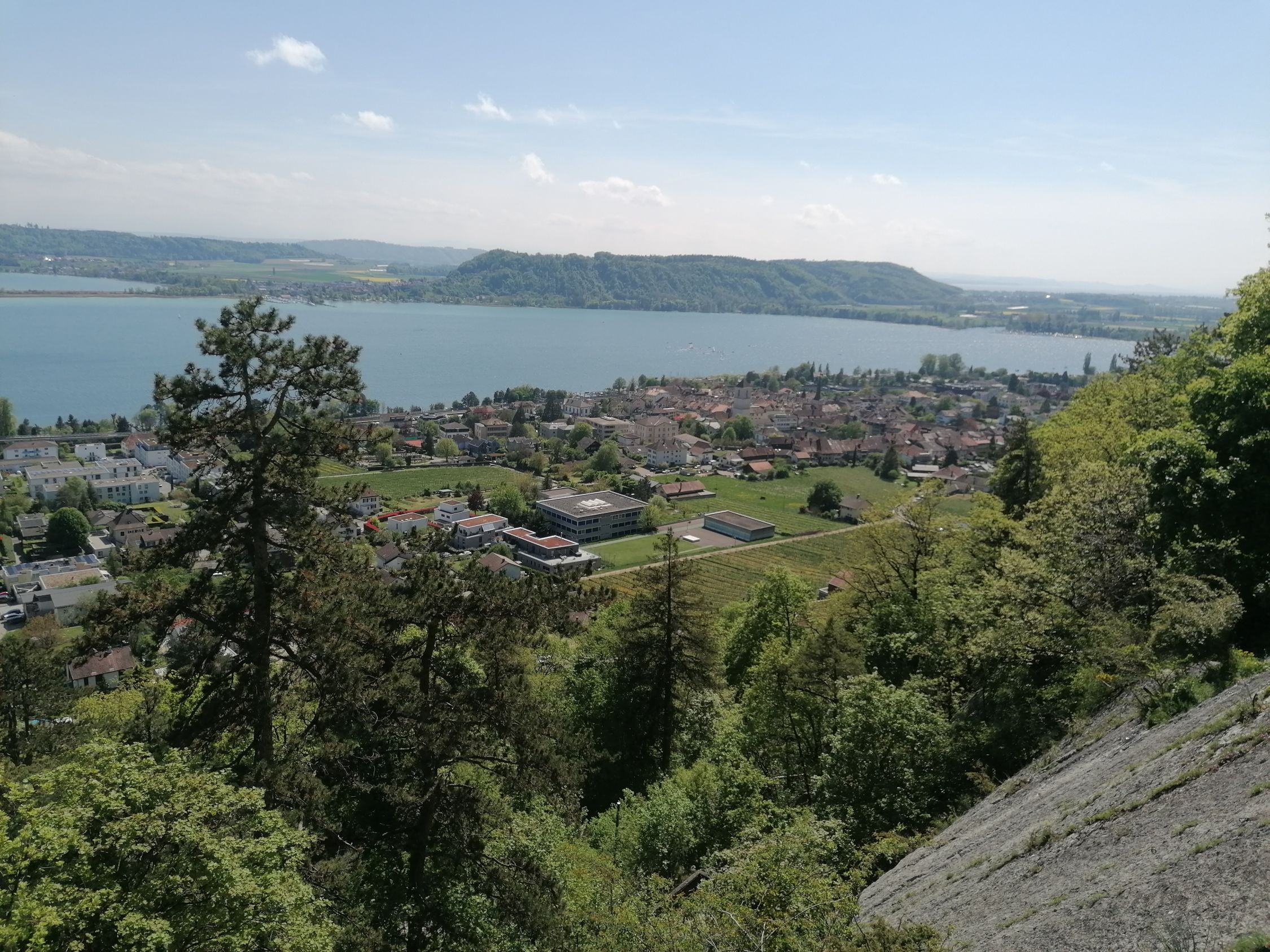 Vom lieblichen Winzerdorf La Neuveville durch die Altstadt nach Norden. Beim historischen Brunnen nach Rechts die Weinberge hinauf der Strasse Chemin du Tirage zum Klettergarten. 20 Minuten.
