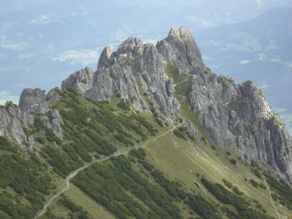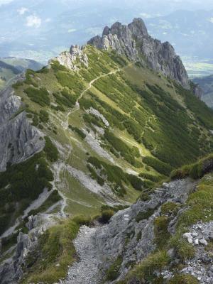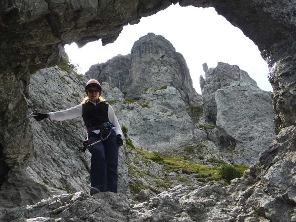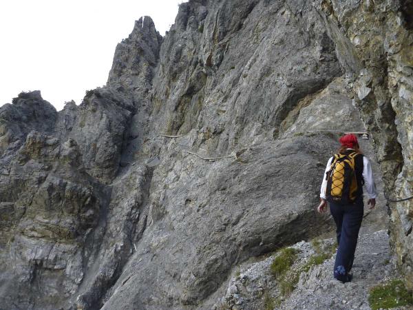 Der Dreischwesternsteig ist ebefalls häufig drahtseilgesichert, geht mehr über echten Fels, aber auch nirgends steil oder ausgesetzt.