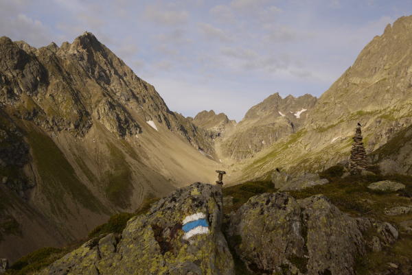 Der Weg ab Hütte führt bald über Block- und Schuttgestein Richtung Saaspass, etwas mühsam, aber kein Schnee.