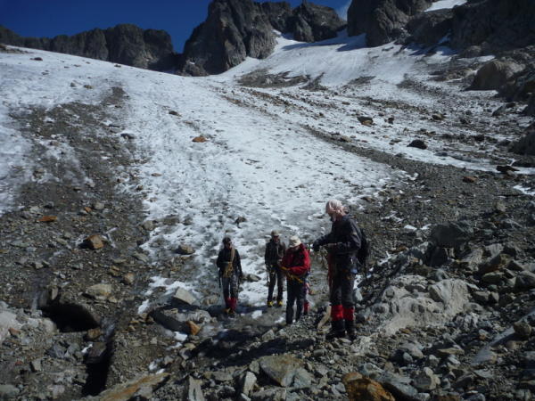 Gletscher bis Felsriegel unterhalb Stössensattel weitgehend blank. Spalten sichtbar, teilweise noch Schneebrücken. Felsriegel mit Fixseil gut eingerichtet, jedoch Vorsicht mit losem Gestein. Firnteile des Grates schneebedeckt, Felsteile trocken, gut begehbar.